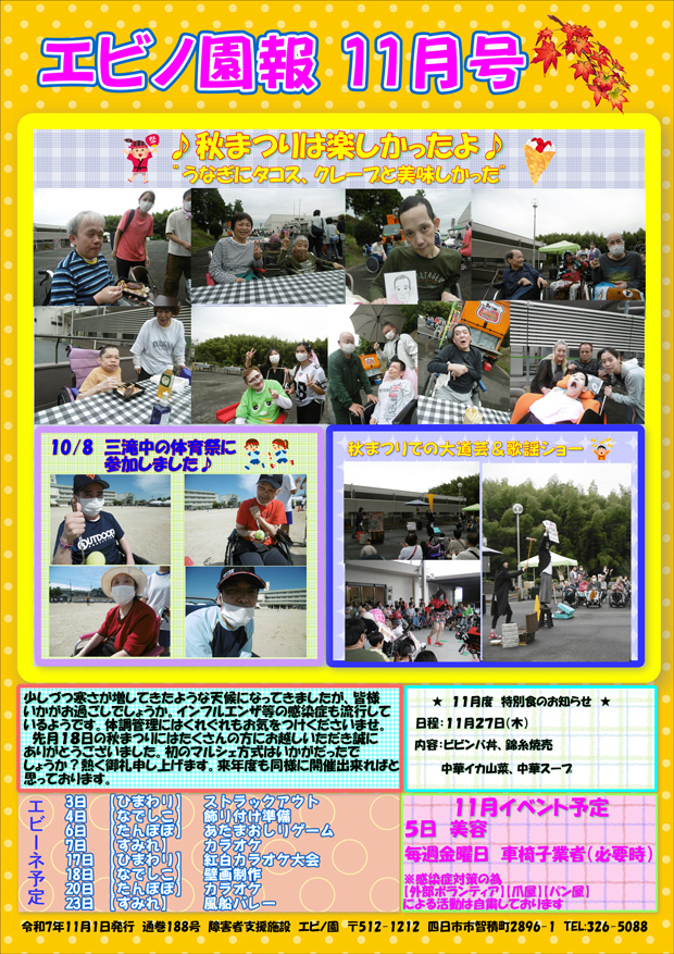 エビノ園報11月号 通巻188号を掲載しました 「♪秋まつりは楽しかったよ♪」
