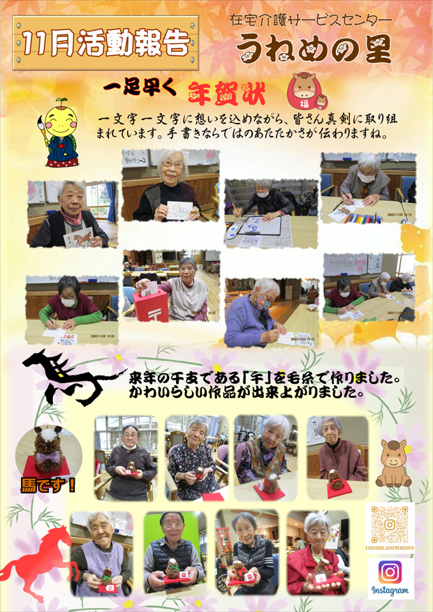 ★一足早く 年賀状 一文字、一文字に想いを込めながら、皆さん真剣に取り組まれています。手書きならではのあたたかさが伝わりますね。★干支の馬作り来年の干支である「午」を毛糸で作りました。かわいらしい作品が出来上がりました。