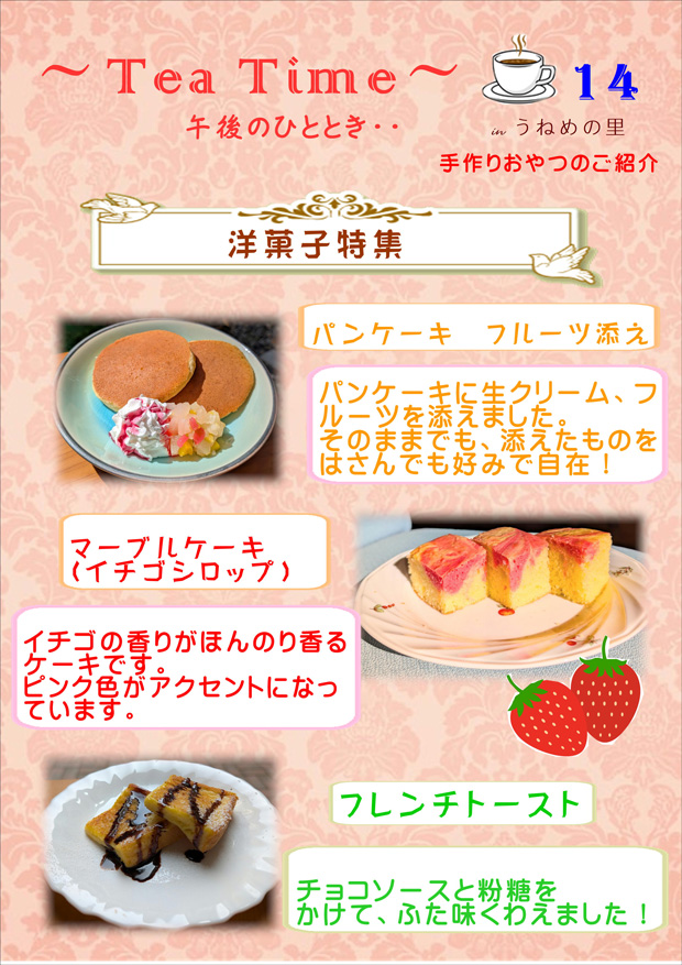 今回は、甘い香りに心躍る『洋菓子特集』です✨ 🥞パンケーキ フルーツ添えパンケーキに生クリーム、フルーツを添えました。そのままでも、添えたものをはさんでも好みで自在!🍓マーブルケーキ(イチゴシロップ)イチゴの香りがほんのり香るケーキです。ピンク色がアクセントになっています。🍞フレンチトーストチョコソースと粉糖をかけて、ふた味くわえました! 笑顔あふれる素敵な午後のひとときとなりました🎶